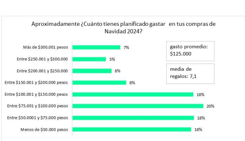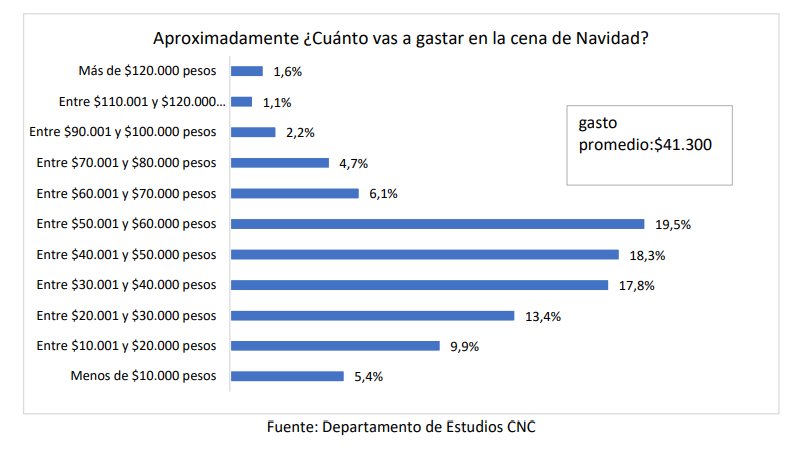 Otro aspecto importante es la cena navideña. Según el estudio, un 61% afirmó que incurrirá en gastos relacionados con esta, y un 55% se encuentra en un rango de gasto entre $30.000 y $60.000. El gasto promedio por persona es de $41.000, considerando un grupo promedio de 5,6 personas.