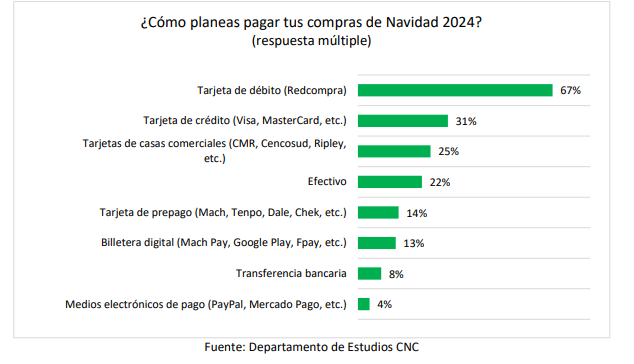 Respecto a los medios de pago, destaca la tarjeta de débito, con un 67% que planea pagar sus compras con ella. Le sigue la tarjeta de crédito, mencionada por un 31%, y las tarjetas de casas comerciales, con un 25%, que han aumentado significativamente respecto a 2023. Luego, un 22% menciona el efectivo, un 14% las tarjetas de prepago y un 13% las billeteras digitales.