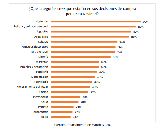 Las categorías más demandadas son vestuario, un 92% cree que comprará en esta categoría; seguida de belleza y cuidado personal, con un 87%; juguetes, con un 82%; y accesorios, con un 80%. Más atrás se encuentran calzado (68%), artículos deportivos (66%), entretenimiento (65%) y librería (61%).