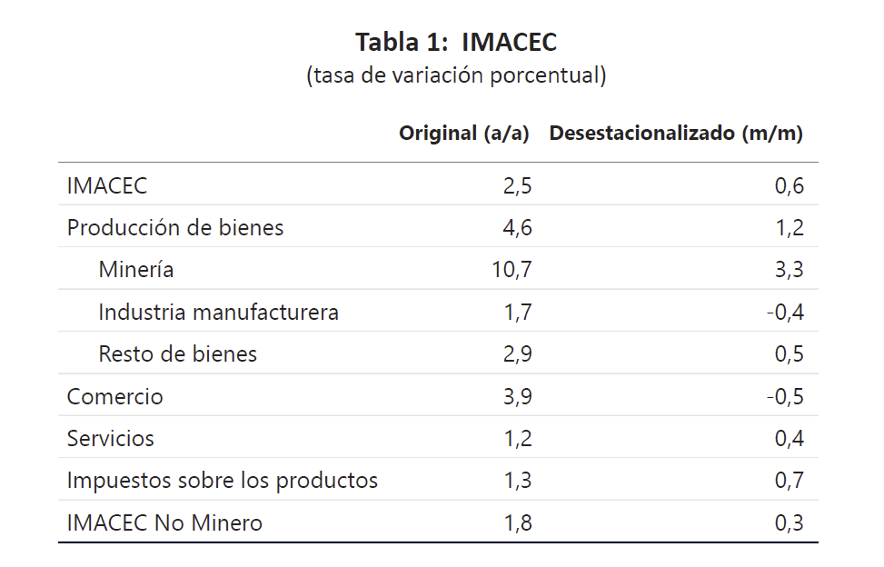 Por su parte, el Imacec no minero presentó un crecimiento anual de 1,8%, mientras que en términos desestacionalizados aumentó 0,3% respecto del mes anterior y un 2,4% en 12 meses.