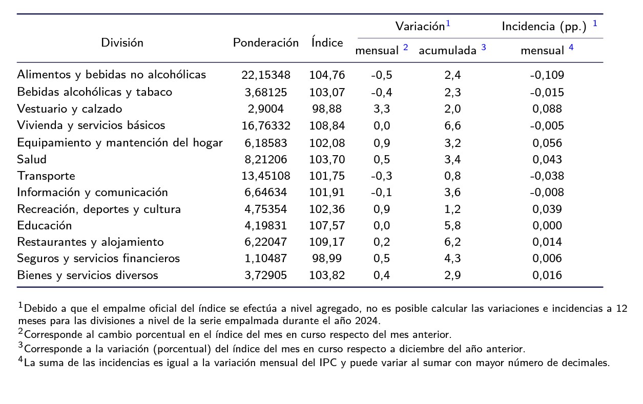 De acuerdo con el INE, siete de las 13 divisiones que conforman la canasta del IPC aportaron incidencias positivas en la variación mensual, mientras que cinco presentaron incidencias negativas y una división registró nula incidencia.