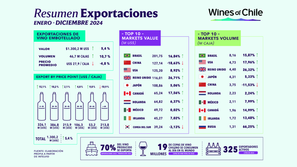 El año que ha quedado atrás tuvo buenas noticias en materia vitivinícola. El análisis de Vinos de Chile da cuenta de que 2024 cerró con un aumento en las exportaciones de vino embotellado, tanto en cuanto a la cantidad como al valor al que se comercializa.