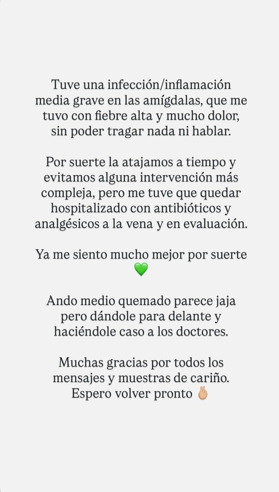 Luego, durante esta jornada, detalló que padece “una infección/inflamación media grave en las amígdalas, que me tuvo con fiebre alta y mucho dolor, sin poder tragar nada ni hablar”.