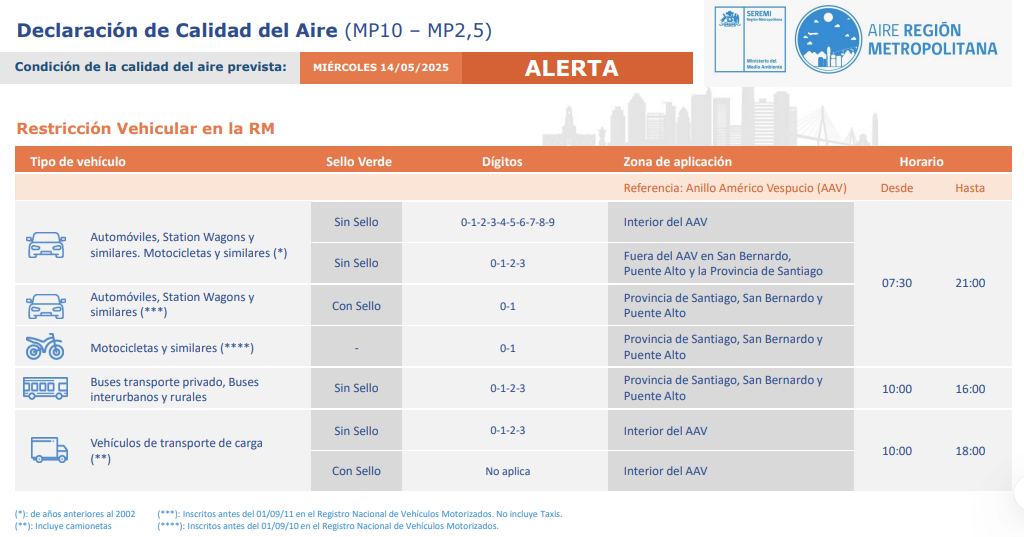 #???_?? | Adversas condiciones de ventilación tendrá la cuenca de Stgo este miércoles x lo q la @DPR_RM -por recomendación de @MMAMetropolitan– declara #AlertaAmbiental en toda la #RM para este 14 de mayo