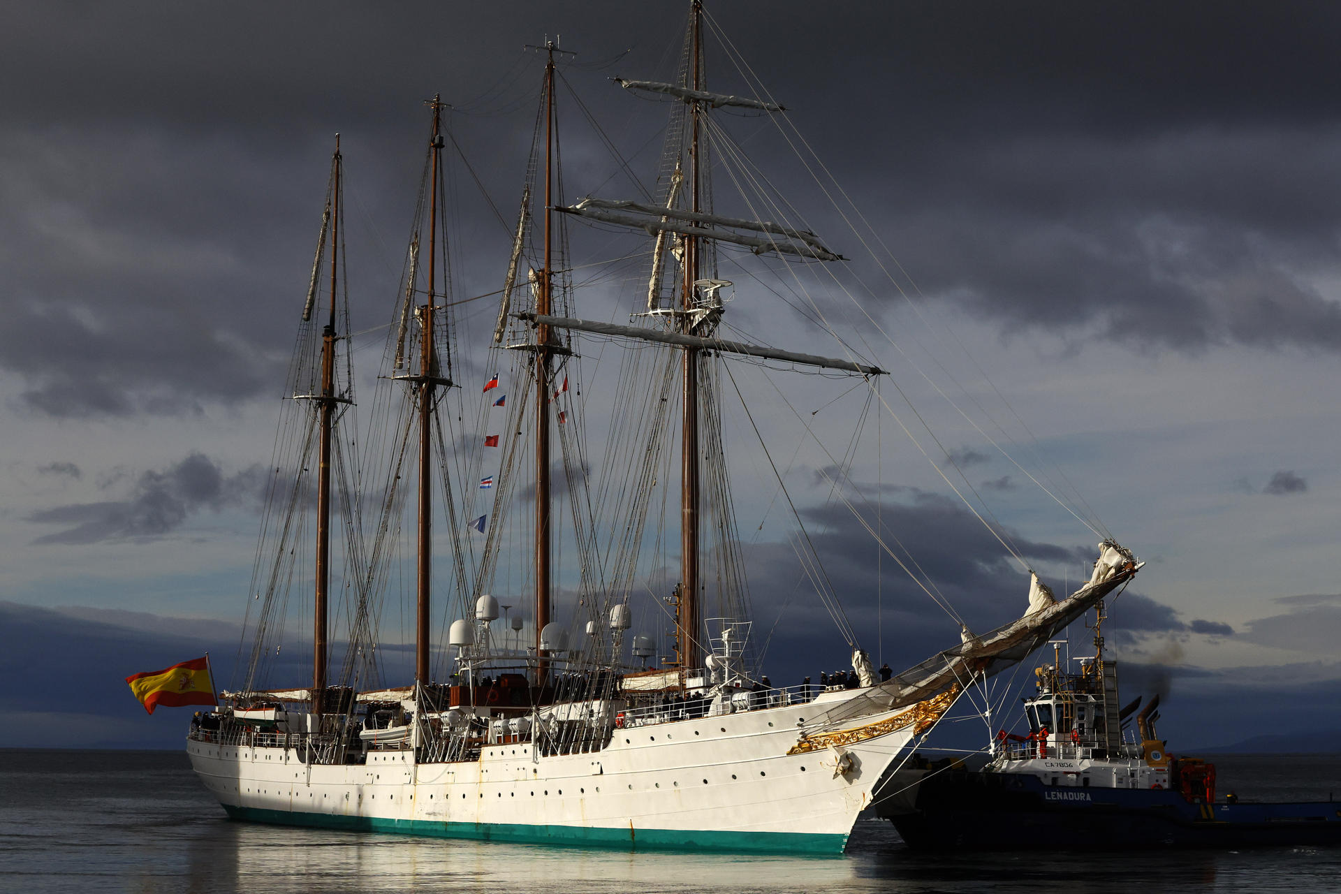 El buque escuela español Juan Sebastián de Elcano zarpa este domingo, en el muelle Prat, del puerto de Punta Arenas (Chile). El buque escuela español Juan Sebastián de Elcano zarpó en dirección a Valparaíso, en la costa central central chilena. EFE/ Paul Plaza.