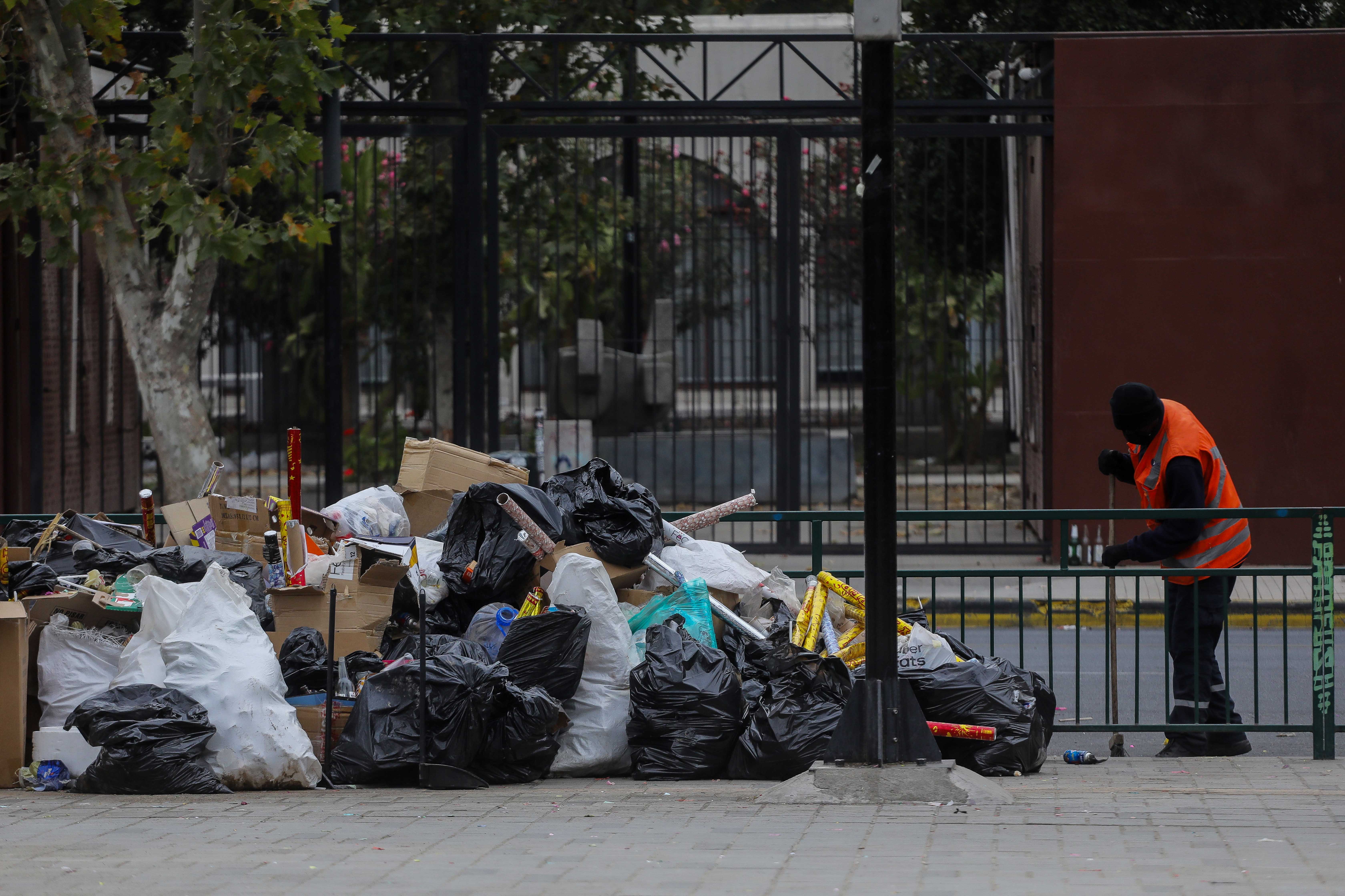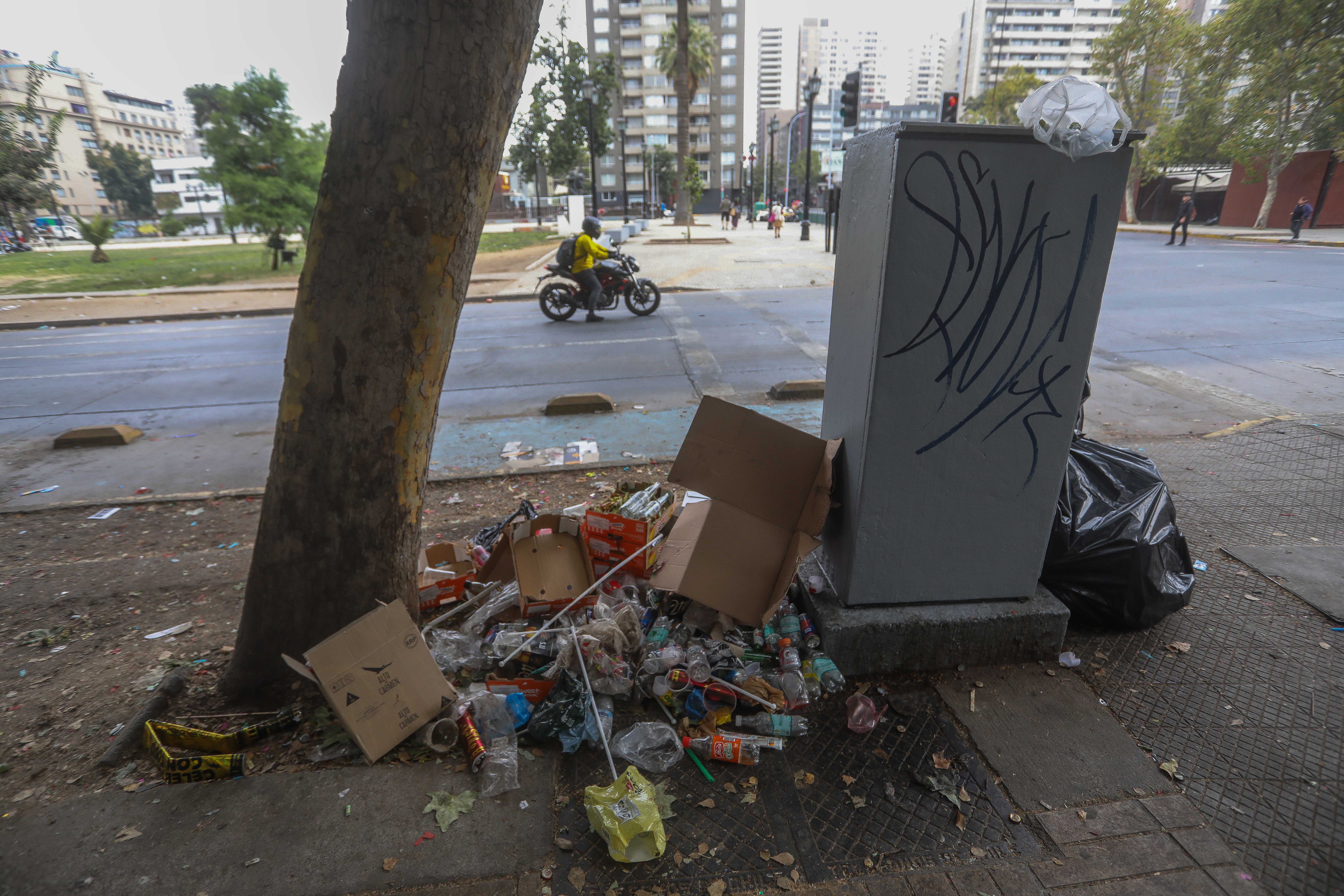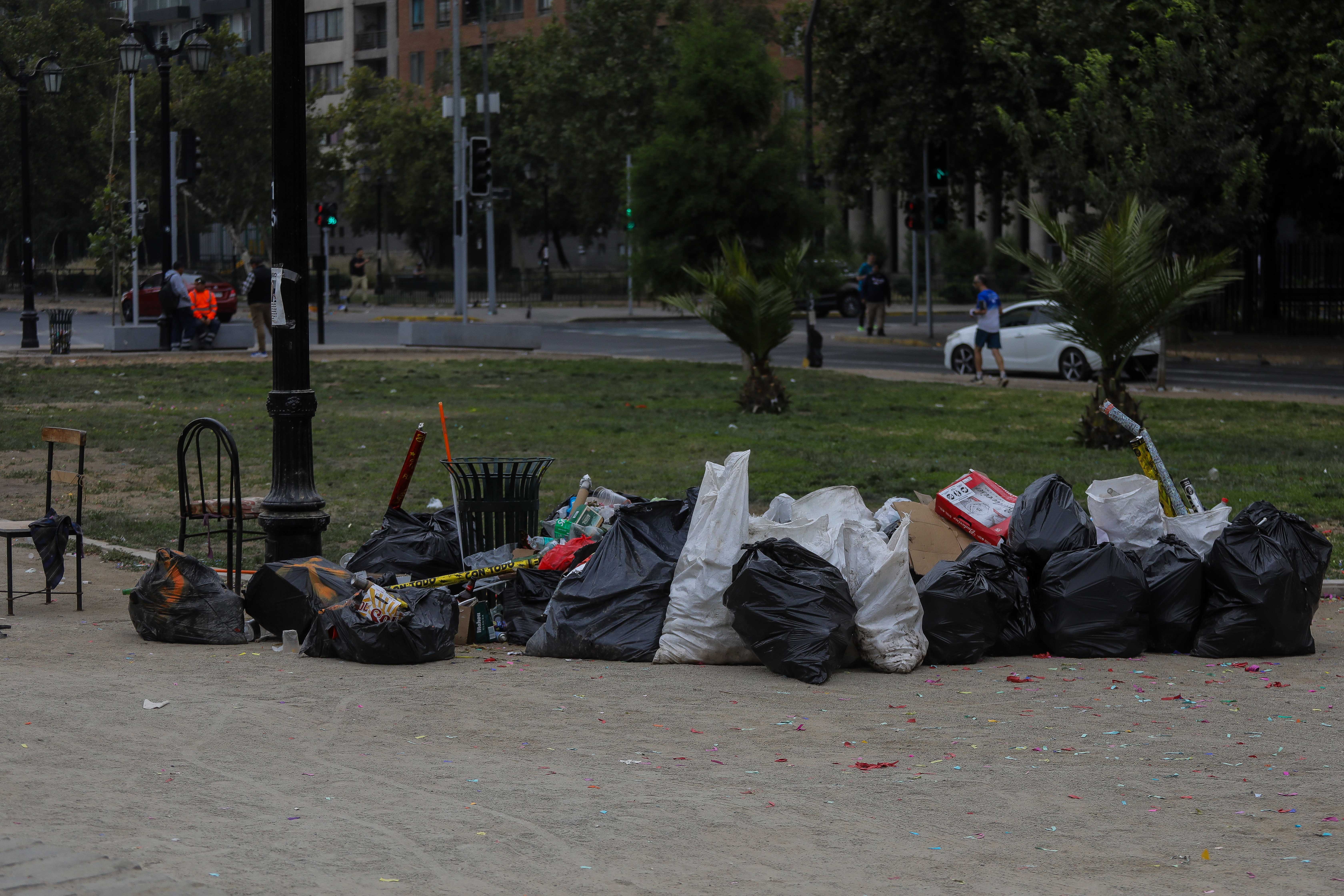 El Parque Almagro de Santiago amaneció este domingo con grandes cantidades de basura, botellas y restos de celebraciones, luego de la concentración registrada la noche anterior tras conocerse la captura de Nicolás Maduro en Venezuela.