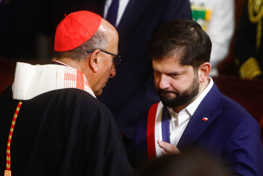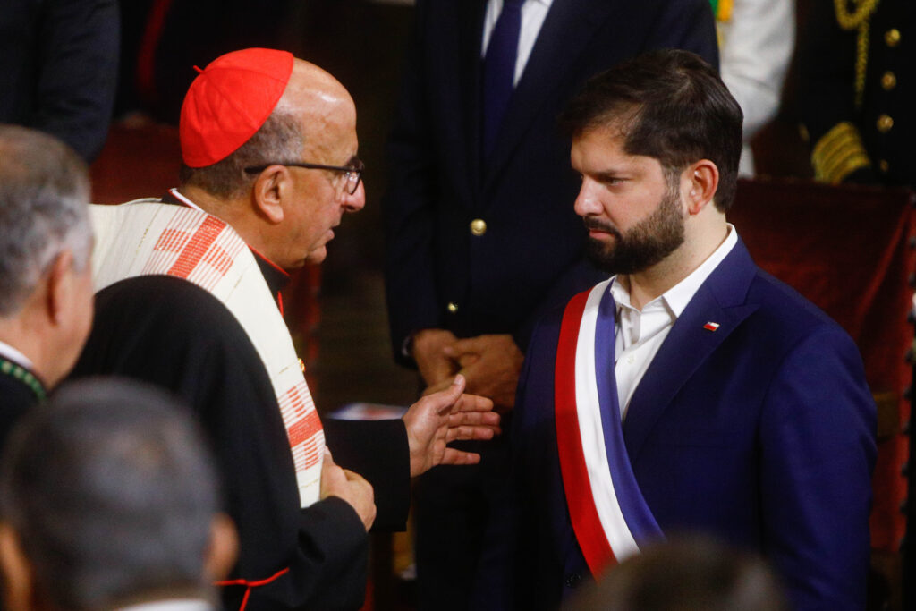 El Presidente de la república, Gabriel Boric, junto al arzobispo, monseñor Fernando Chomali,al finalizar el Te deum ecuménico 2025 en la catedral metropolitana de Santiago.
