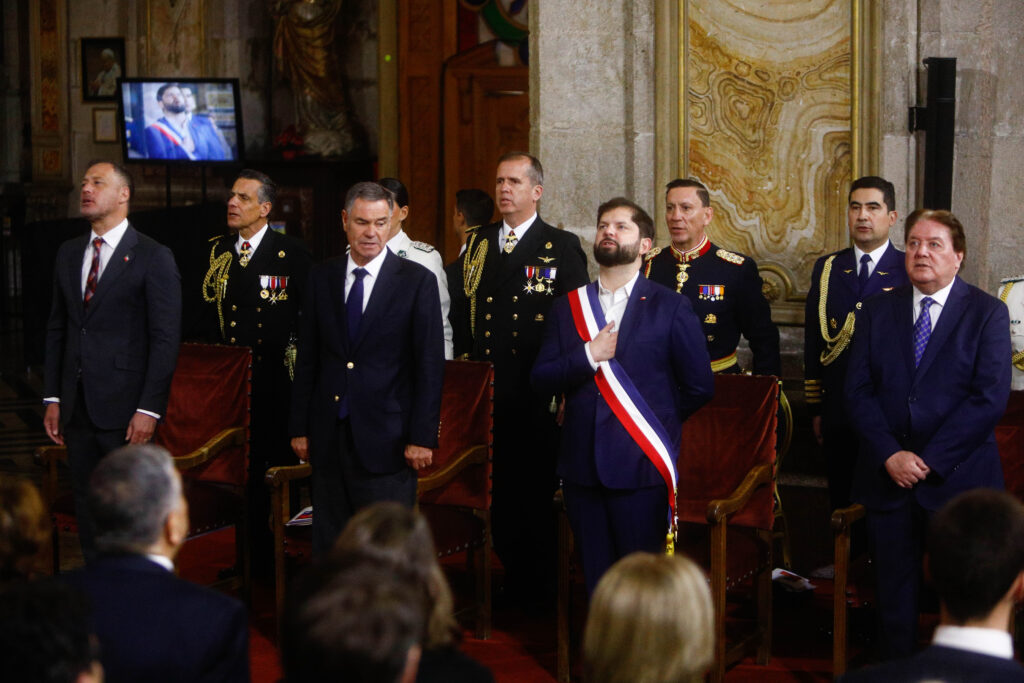 (De Izq. a Der.) El presidente de la cámara de diputados, Jose Miguel Castro, el presidente del senado, Manuel jose Ossandon, el presidente de la republica, Gabriel Boric y el presidente de la corte suprema, Ricardo Blanco, participan del Te deum ecuménico 2025 en la catedral metropolitana de Santiago y en el marco de la celebración de las fiestas patrias 2025.