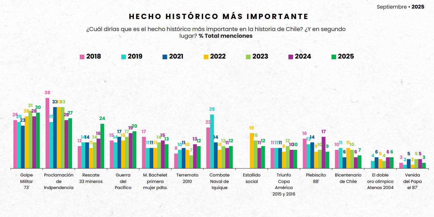 El golpe militar de 1973 se mantiene como el hecho histórico más importante (30%), seguido de la Proclamación de Independencia y el rescate de los 33 mineros (+8 puntos).