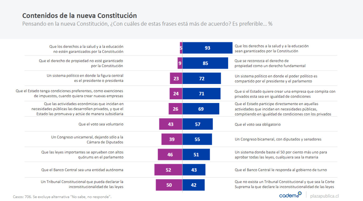 Respecto a los contenidos de la nueva Constitución, 93% está de acuerdo con que “los derechos a la salud y a la educación sean garantizados por la Carta Magna” y 85% con que “se reconozca el derecho de propiedad como un derecho fundamental”.