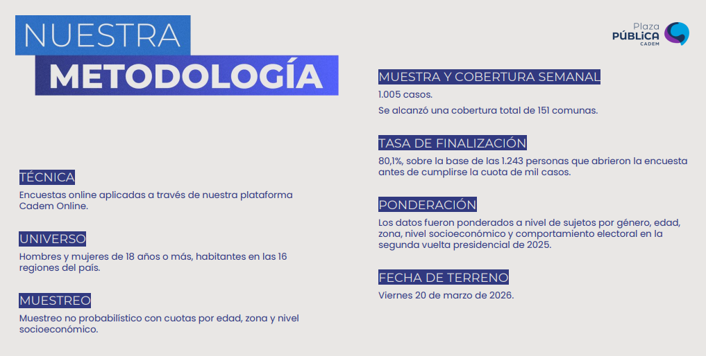 Todos los datos en un solo lugar #InsightChile #PlazaPública pic.twitter.com/xdRWhfuXLz— Cadem_cl (@Cadem_cl) March 22, 2026