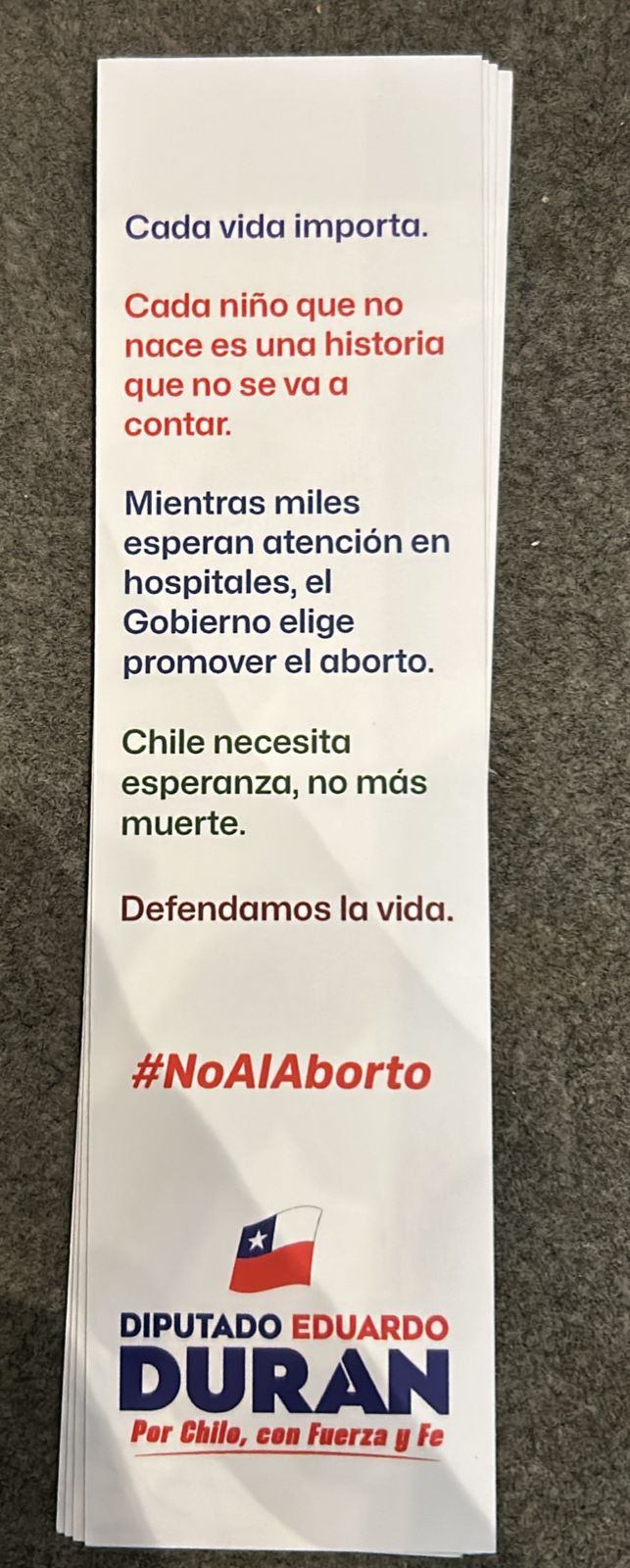 Tras el anunció del gobierno de avanzar en un proyecto de aborto libre, el diputado Eduardo Durán llevó al discurso presidencial separadores de libros con mensajes contra el aborto y pro vida.