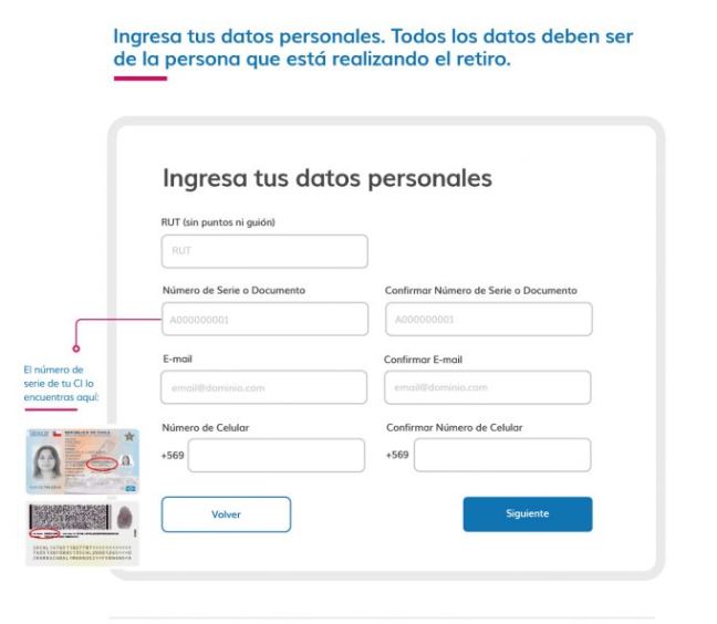 Tu RUT (el que debe ser escrito sin puntos ni guión), el número de serie de tu carnet de identidad, la dirección de tu correo electrónico (donde llegara un correo una vez finalices el proceso) y tu número de celular.