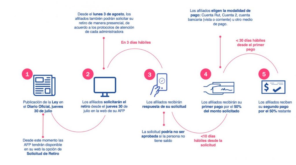 La ley establece que el primer pago debe entregarse en un plazo máximo de 10 días hábiles contado desde la fecha de la presentación de la solicitud de retiro a la administradora. El segundo pago, en tanto, debe ser pagado en el plazo máximo de 30 días hábiles desde la fecha del primer pago.