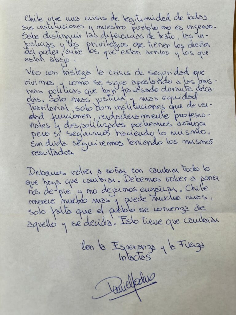 En la misiva el exalcalde abordó también las crisis de legitimidad institucional y de seguridad a nivel país, asegurando que la ciudadanía “sabe distinguir las diferencias de trato, las injusticias y los privilegios que tienen los dueños del poder, entre los que están arriba y los que están abajo”.
