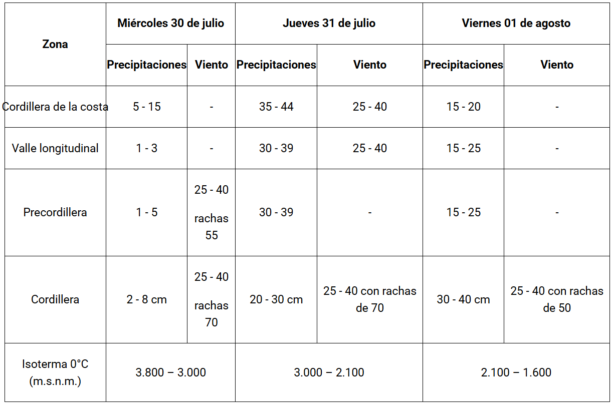 A ello se suma otro por precipitaciones, las que se esperan para este miércoles, jueves y viernes, pero especialmente el 31, con montos que llegarían hasta a los 44 mm en zonas de la cordillera de la costa.