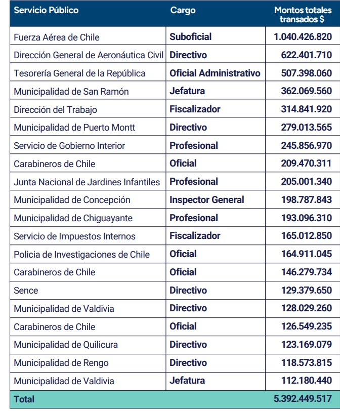 En el caso de la Fuerza Aérea de Chile (FACh), que involucró a dos funcionarios, y de otros 10 pertenecientes a la Dirección General de Aeronáutica Civil (DGAC), el Ministerio de Defensa envió oficios a ambas reparticiones públicas para que informen —en un plazo de cinco días— las acciones y sumarios que realizarán con el objetivo de establecer las responsabilidades correspondientes y fortalecer los mecanismos de control interno.