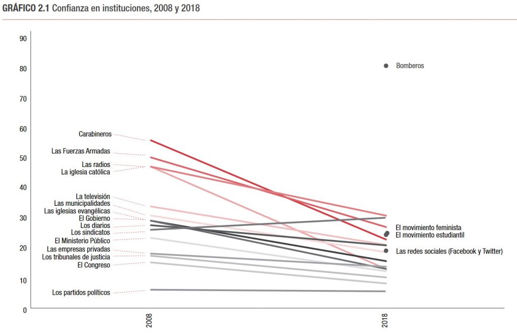 Carabineros, las Fuerzas Armadas y la Iglesia Católica, en el año 2008, se caracterizaban como las instituciones con un nivel considerablemente alto de confianza. Sin embargo, de acuerdo a lo indicado en el estudio, al 2018 la única institución que obtiene la confianza de más de un tercio de los encuestados es Bomberos.