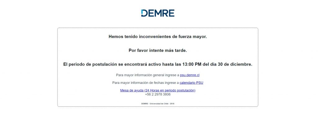 Por el momento, al ingresar a la sección de postulación la página web señala que debido a “inconvenientes de fuerza mayor” los estudiantes deberán intentar ingresar más tarde.