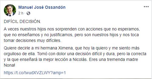 El hermano de la diputada, el senador Manuel José Ossandón no tardó en alabar la actitud adoptada por la parlamentaria.