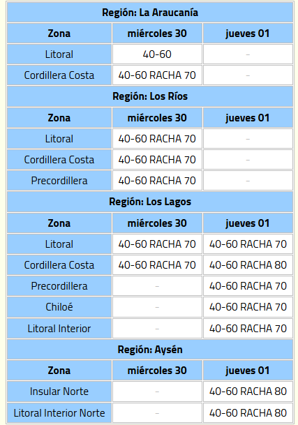 Según el informe de la DMC, se esperan rachas de viento que oscilarán entre los 40 y 80 kilómetros por hora, dependiendo de la zona. En particular, las mayores intensidades se concentrarían en sectores costeros y zonas interiores de la región de Los Lagos y Aysén durante la jornada del jueves.