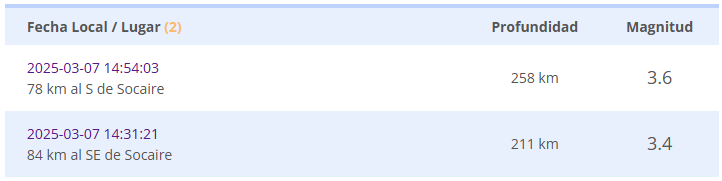 Este evento tuvo una magnitud de 3.6 y alcanzó una profundidad de 258 kilómetros.