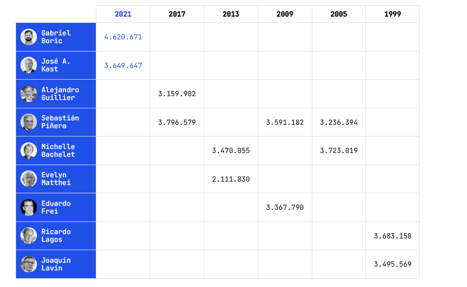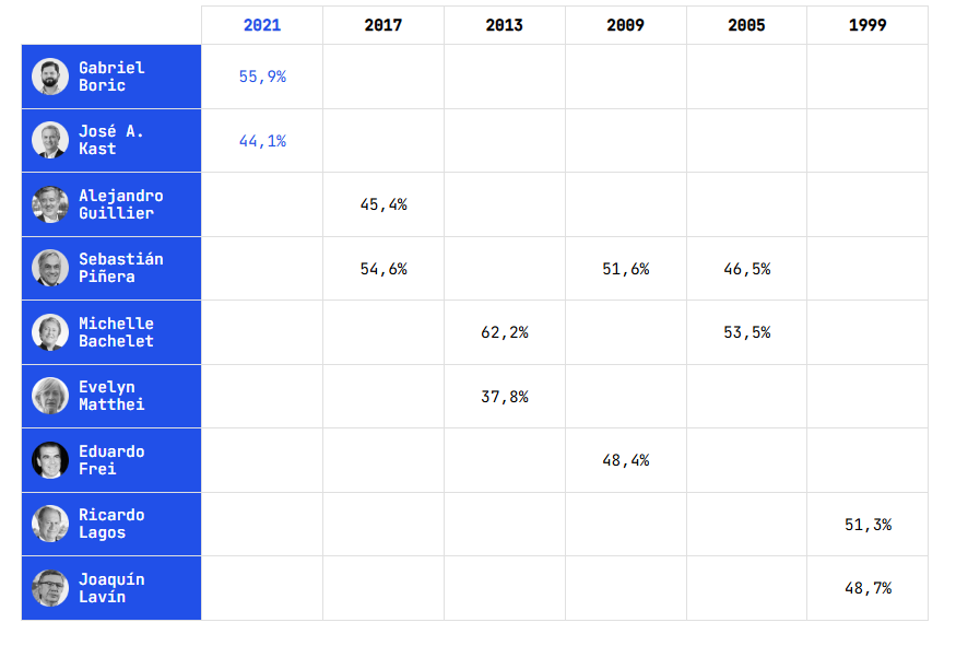 Mira aquí los resultados de las segundas vueltas presidenciales en Chile, desde la más reciente hasta 1999.