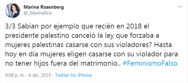 Mientras que en el tercer tuit recordó lo reciente que es la cancelación de la ley que obligaba a las mujeres en Palestina a casarse con su violadores.