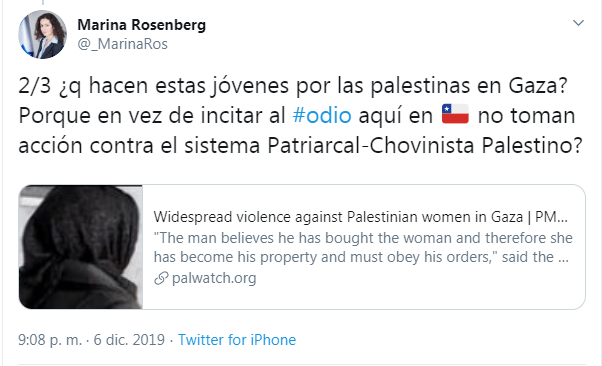 En otra de las publicaciones Rosenberg emplazó a las jóvenes para que tomen acciones contra el sistema Patriarcal-Chovinista Palestino.