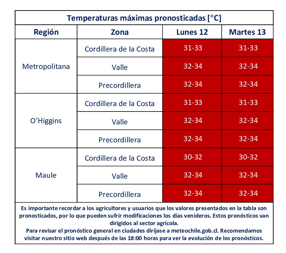 Este lunes, la Dirección Meteorológica de Chile (DMC) emitió una advertencia agrometeorológica por altas temperaturas en la zona centro.