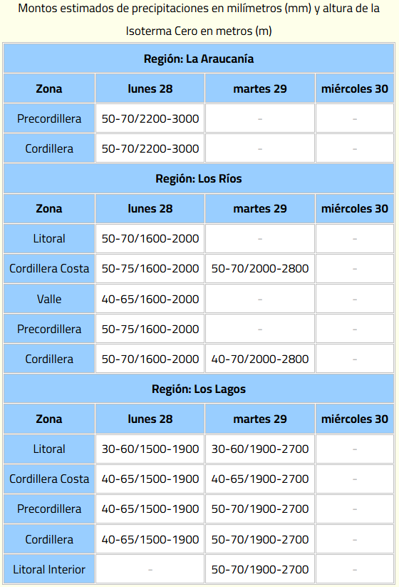 Desde el organismo detallaron que se trata de precipitaciones normales a moderadas con Isoterma Cero Alta,