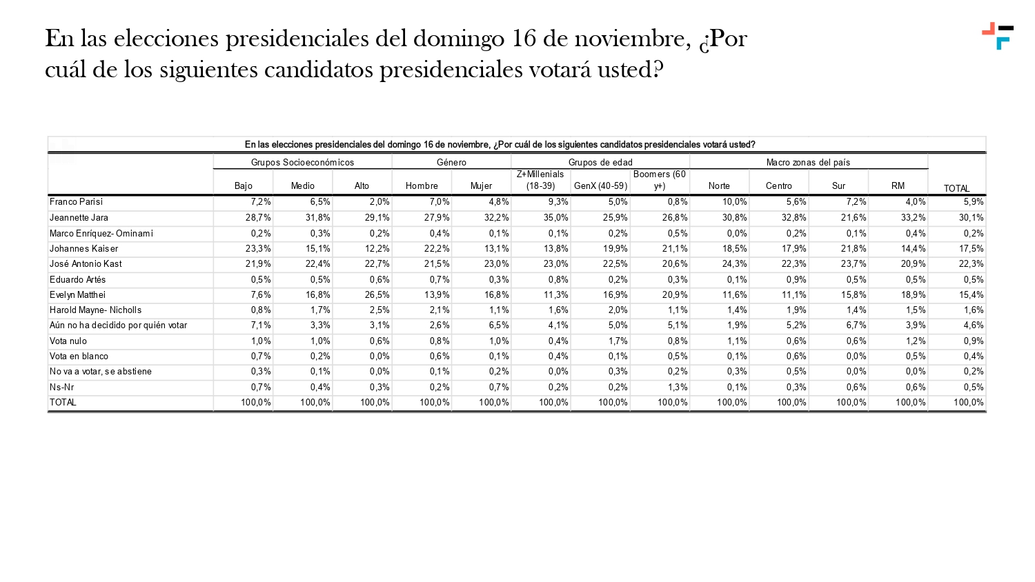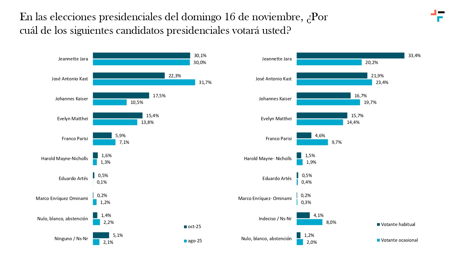 Según el sondeo, en la intención de voto presidencial para una primera vuelta, la candidata del pacto Unidad por Chile, Jeannette Jara, lidera las preferencias con un 30,1%. En segundo lugar, se ubica el abanderado del Partido Republicano, José Antonio Kast, con 22,3%.