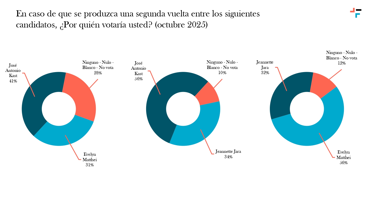 El estudio también evaluó distintos escenarios de segunda vuelta. En ambos casos simulados, José Antonio Kast se impondría tanto frente a Jeannette Jara como ante Evelyn Matthei.