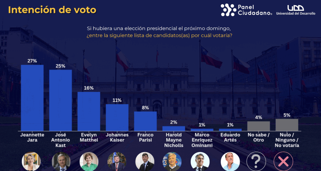 En la intención de voto de primera vuelta, Jeannette Jara lidera con 27%, seguida por José Antonio Kast con 25% y Evelyn Matthei con 16%.
