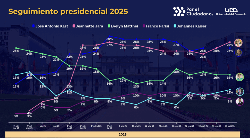 En tanto, el seguimiento 2025 muestra que Jara viene al alza desde marzo (cuando registraba 4%) hasta el 27% actual; Kast se ha mantenido en un rango acotado que desemboca en 25% en esta lectura; y Matthei se estabiliza en torno a 16%.