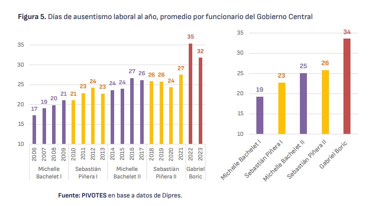 “Durante el primer gobierno de Michelle Bachelet, los días de ausentismo laboral promedio anual por funcionario fue de 19 días; en el primer gobierno de Sebastián Piñera fue de 23 días; en el segundo gobierno de Bachelet fue de 25 días; en el segundo periodo de Piñera fue de 26 días; y en la primera mitad del gobierno de Gabriel Boric, el número anual de días hábiles no trabajados por funcionario público ha sido de 34 días, alcanzado el máximo desde que existe registro”, indicaron en el estudio.