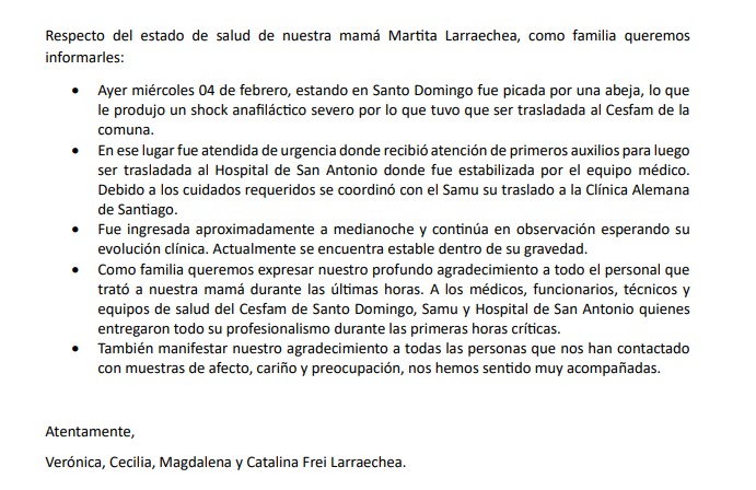 La familia de Marta Larraechea entregó una declaración pública para informar sobre su estado de salud, tras un episodio registrado el miércoles 4 de febrero en la comuna de Santo Domingo.