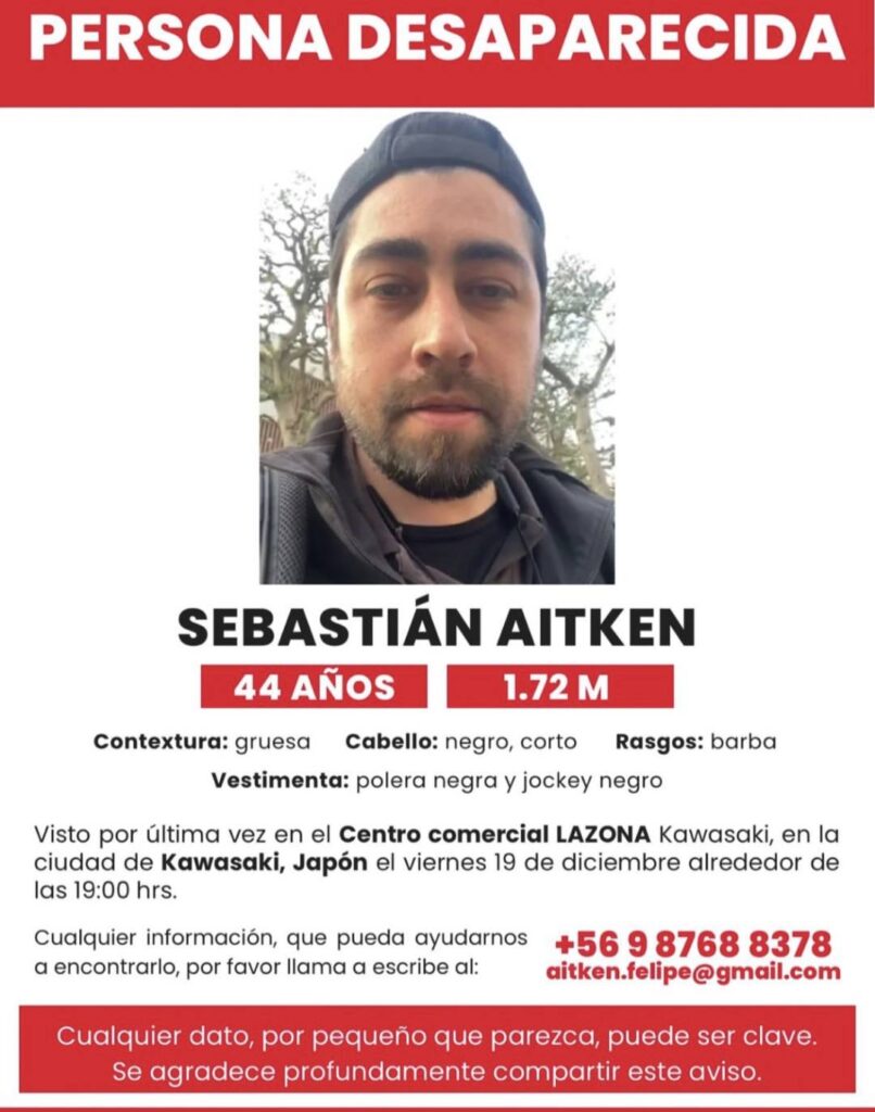 La familia del chileno Sebastián Aitken (44) reportó su desaparición en Japón, donde reside desde hace dos décadas. El hombre fue visto por última vez el 19 de diciembre a las 19:00 horas en el centro comercial LAZONA Kawasaki, dentro del área metropolitana de Tokio.