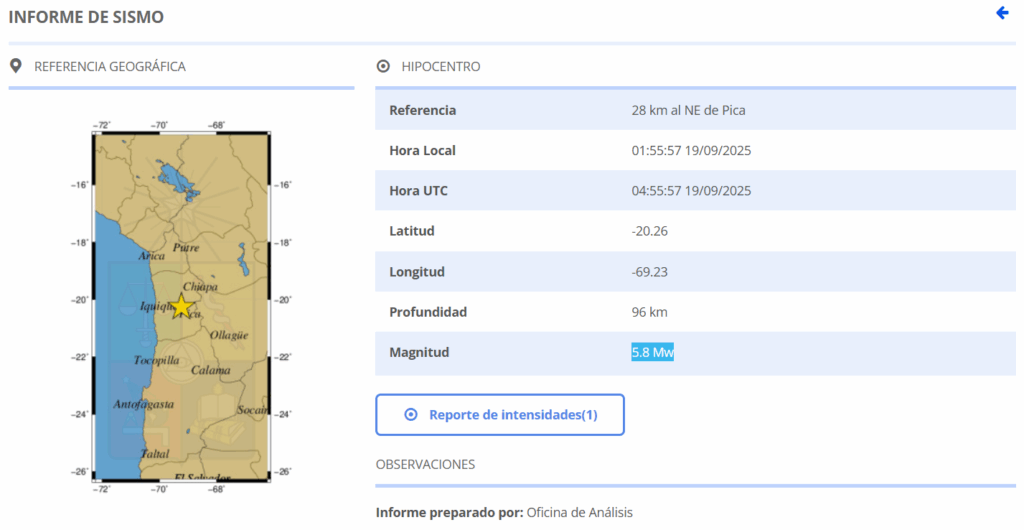 De acuerdo con los datos preliminares entregados por el organismo, el epicentro se localizó a 28 kilómetros al noreste de la comuna de Pica, con una profundidad de 96 kilómetros.