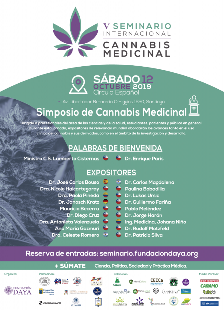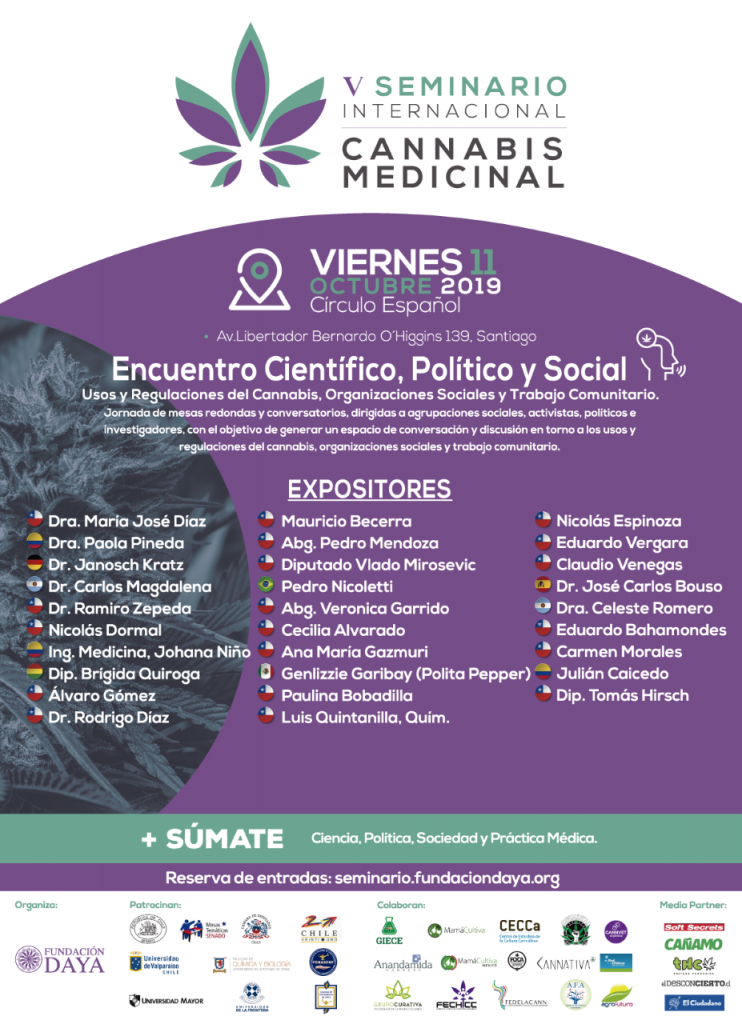 Este viernes 11 y sábado 12 de octubre se llevará a cabo el V encuentro internacional organizado por la Fundación Daya sobre el cannabis medicinal. La primera jornada tendrá lugar en el Centro Arte Alameda, la segunda, en tanto, se realizará en el Círculo Español.