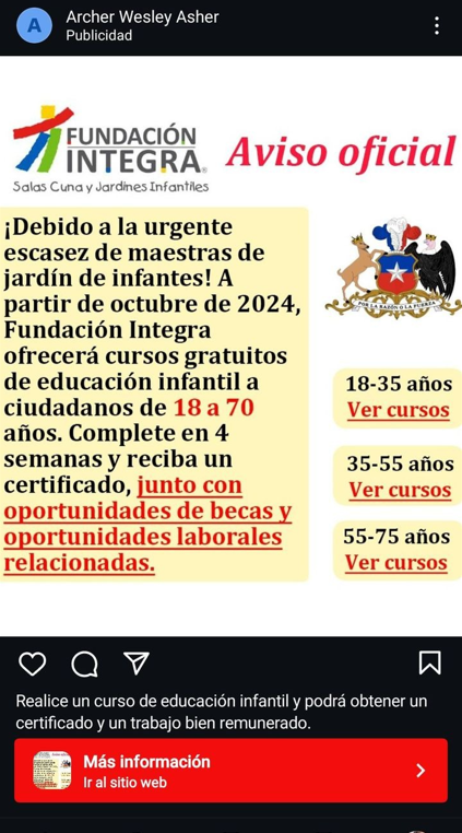 Desde la fundación indicaron que “producto de publicaciones detectadas en redes sociales, donde se promocionan ‘cursos gratuitos de capacitación’ a nombre de Fundación Integra, recalcamos no son comunicaciones oficiales y su contenido no es verídico”.