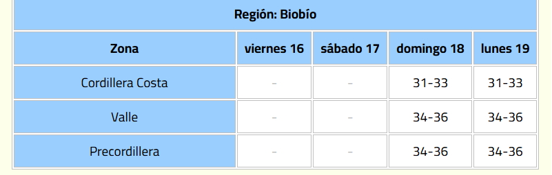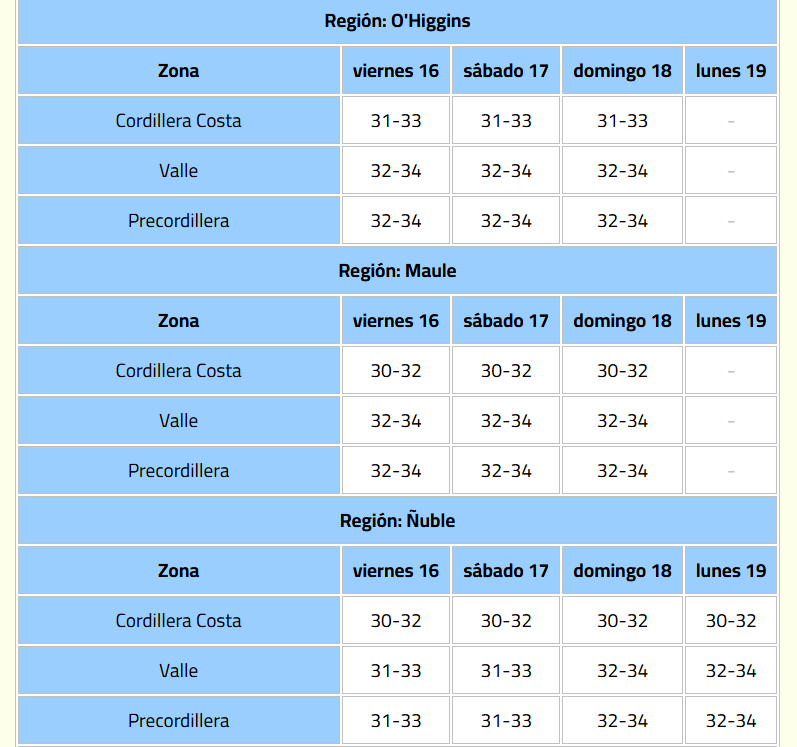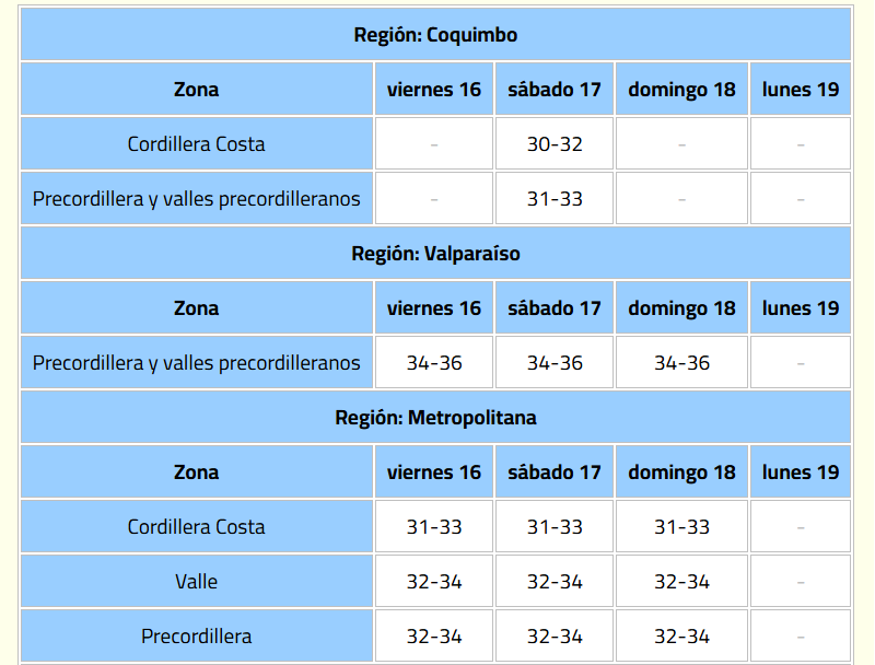 La Dirección Meteorológica de Chile (DMC) emitió un aviso meteorológico por altas temperaturas, vigente desde la tarde del viernes 16 hasta el lunes 19 de enero.