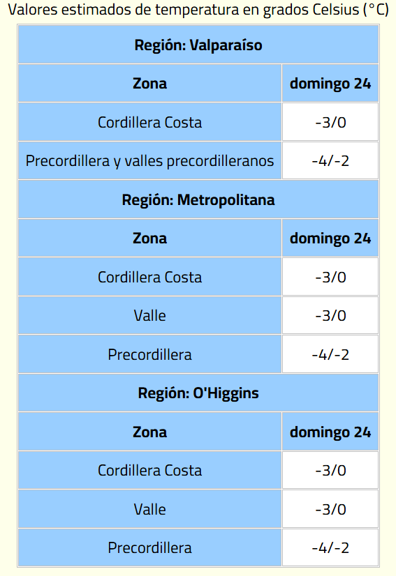 El fenómeno afectará diversos sectores de las regiones de Valparaíso, Metropolitana y O’Higgins desde madrugada del domingo 24 hasta la mañana de esa misma jornada.