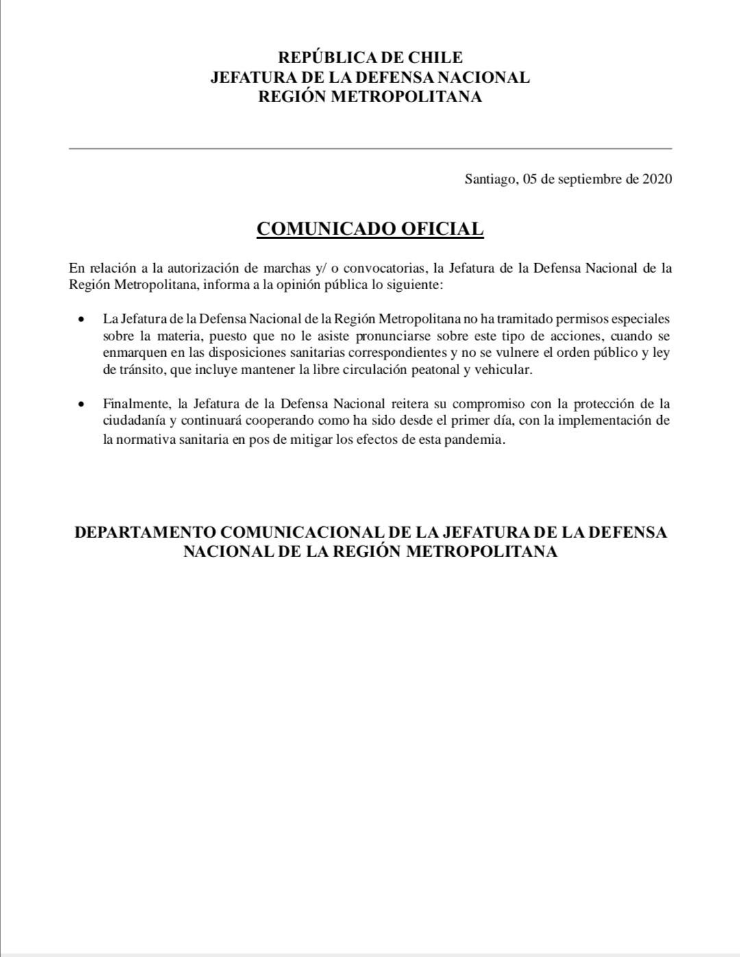 En ese contexto, la Jefatura de Defensa Nacional de la Región Metropolitana salió a aclarar el hecho y señaló que no han autorizado el desarrollo de ninguna manifestación en la capital.