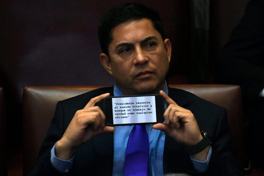 “Presidente, renuncie al sueldo vitalicio y busque un trabajo de verdad como cualquier chileno”, decía el texto que mostró abiertamente en medio del discurso presidencial.