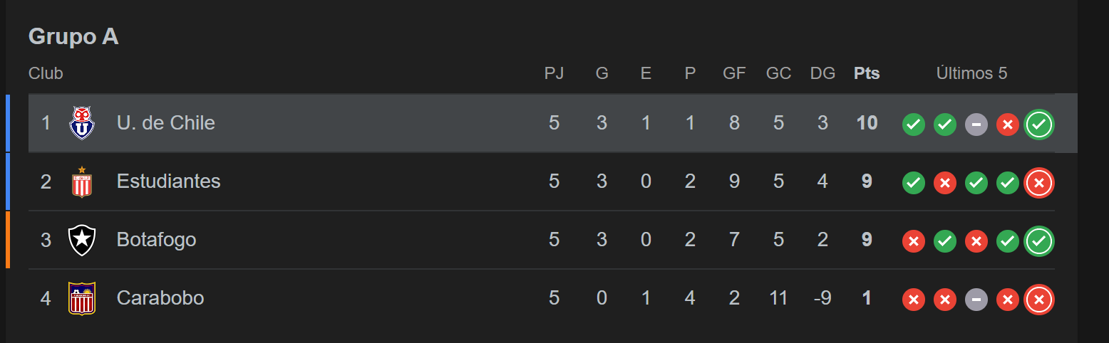Con el grupo extremadamente parejo, el duelo ante Botafogo será decisivo. Si bien Universidad de Chile mostró carácter con victorias clave ante Estudiantes (de visita) y Botafogo (de local), los puntos perdidos ante Carabobo mantienen el suspenso hasta el cierre.