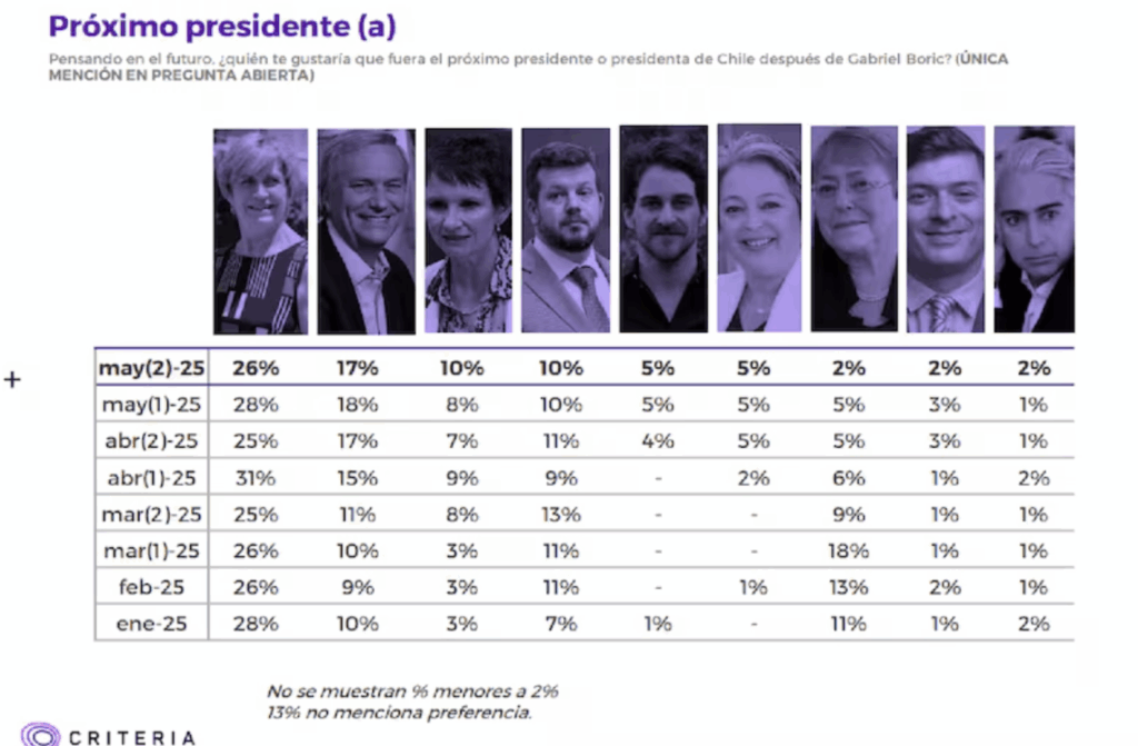 Una nueva entrega de la encuesta Agenda Criteria, correspondiente a la tercera semana de mayo, confirma a Evelyn Matthei como la figura con mayor respaldo ciudadano en las menciones espontáneas de cara a la próxima elección presidencial, aunque con una leve baja respecto al sondeo anterior.