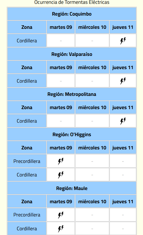 La Dirección Meteorológica de Chile (DMC) actualizó este lunes su aviso meteorológico por tormentas eléctricas en el norte, centro y sur del país.