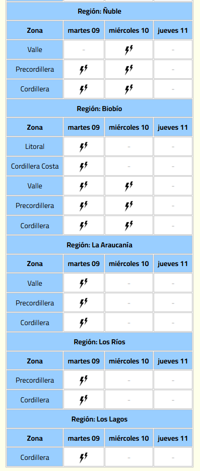 - Región del Biobío (Valle, Precordillera, Cordillera)