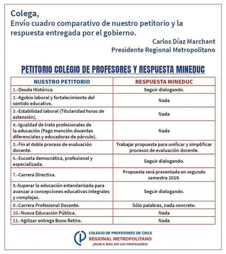 El presidente del Colegio de Profesores, Mario Aguilar, explicó este último ítem comentando el agobio que le provoca a los docentes la cantidad de trabajo administrativo que deben realizar de manera adicional a sus horas de trabajo. “Muchos de los estudiantes lo que requieren es ser escuchados y nosotros muchas veces no tenemos tiempo para escucharlos porque estamos agobiados de pega”, aseguró.
